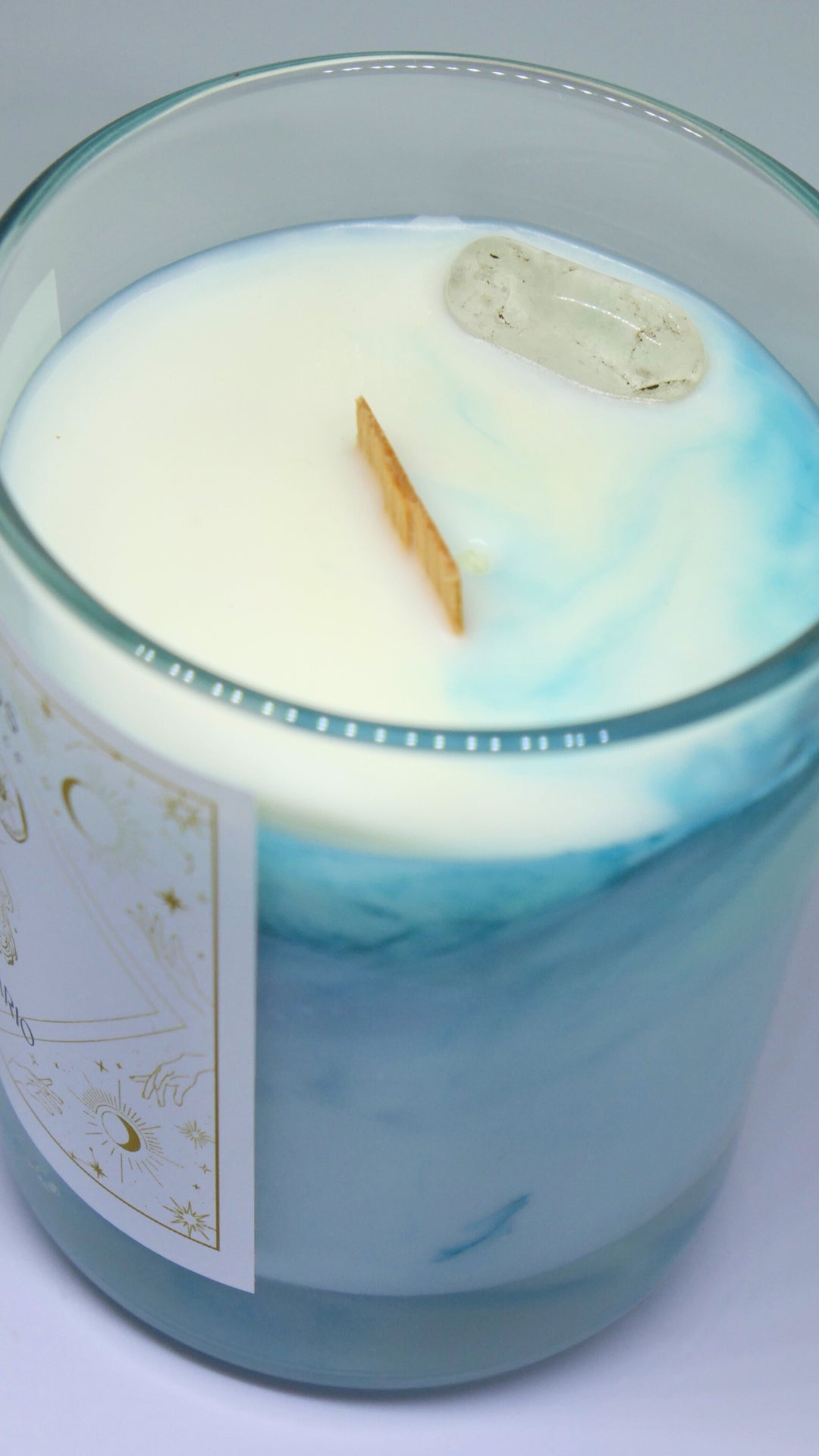 La cera de color azul claro y la amatista fomentan la calma mental, mientras que la fragancia del eucalipto favorece la renovación emocional y la albahaca la claridad mental.
