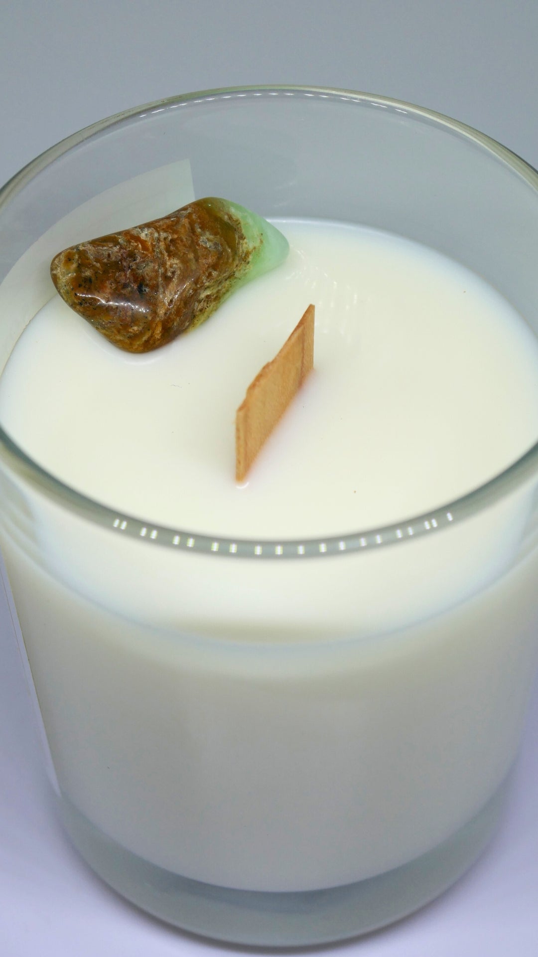 Hechas a mano con 💖y utilizando cera de soja premium, sinergia aromática y gema (piedra mineral semipreciosa)